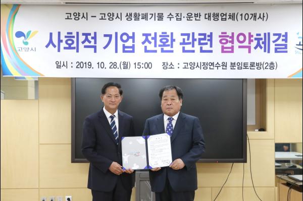 고양시는 지난 28일 고양시 생활폐기물 수집운반 대행업체 10개사와 사회적 기업 전환 관련 협약을 체결했다고 밝혔다.