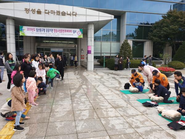 구청사 1층에서 전열기기 사용 과부하로 추정되는 화재가 발생해 청사 일부 소실 및 인명피해가 우려되는 상황을 가정해, 일산소방서 화재 신고 및 상황전파, 인명대피, 환자이송 및 응급처치, 자위소방대의 소화기·소화전을 이용한 체계적인 초기대응 및 화재초동진압 등 화재대비 훈련을 진행했다. 훈련을 마친 후, 소화기 사용법 교육과 심폐소생술 응급처치 시연을 해보는 시간도 마련했다.