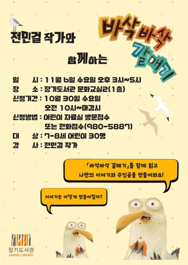 김포시 장기도서관은 ‘전민걸 작가와 함께하는 바삭바삭 갈매기’강좌를 오는 11월 6일 오후 3시부터 5시까지 1층 문화교실2에서 운영한다.
