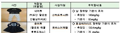 리콜명령 대상 제품인 신화트루니㈜의 ‘히트인 할로윈 긴팔상하세트’는 상의 전면 납 함유량이 149mg/kg로 안전기준을 1.7배 초과했고, ㈜유에스어페럴의 ‘할로윈 해골 튜튜드레스’는 치마 겉감에서 폼알데하이드 함유량이 130.4mg/kg로 안전기준을 1.7배 초과했다.