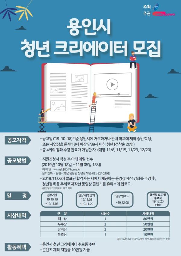 용인시는 유튜브 기획·제작에 참여할 ‘용인시 청년 크리에이터’ 지망생 20명을 오는 11월 5일까지 선착순 모집한다.