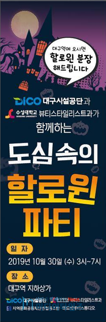 대구시설공단 대구역지하상가는 30일(수), 사회적기업 지역문화공동체 반반협동조합, 대구지역 수성대학교 뷰티스타일리스트과와 손을 잡고 도심 속의 할로윈 파티 행사를 연다.