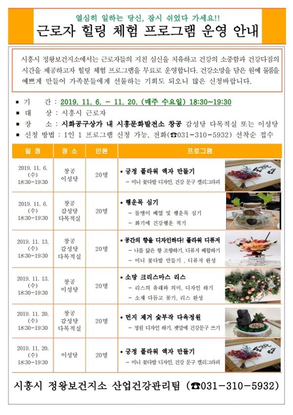 시흥시는 근로자들의 지친 심신을 치유하고 건강의 소중함과 건강다짐의 시간을 제공하고자 힐링 체험 프로그램을 무료로 운영한다.