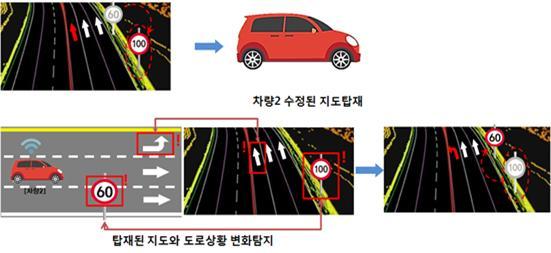 ‘자동 갱신’은 도로 현장과 다르게 임의로 수정된 정밀도로지도를 차량의 실시간 센서정보와 비교해 변화정보를 자동으로 탐지·갱신하고 다시 차량에 전송하는 기술을 시연했다.