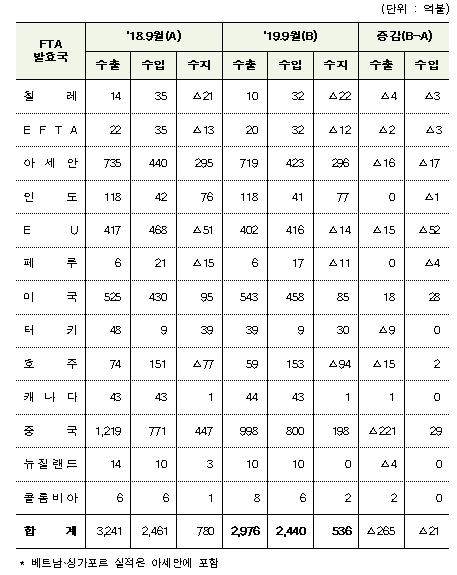 2019년 3/4분기 현재 FTA 발효국과의 교역액은 수출 2976억불, 수입 2440억불로 전년동기 대비 4.2% 감소한 전체 5,416억불을 기록했다.