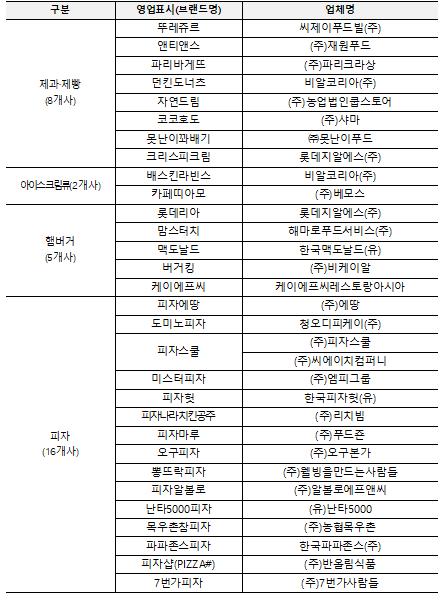 피자, 햄버거 등 조리·판매 식품접객업소 31개사의 가맹점 1만6000여 곳 대상