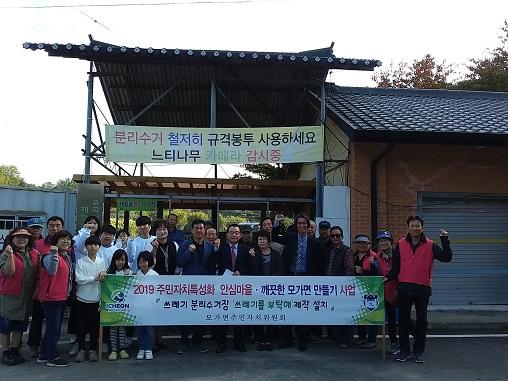 모가면주민자치위원회는 지난 26일 2019년 주민자치특성화사업으로 모가면 어농3리, 소고1리, 송곡1리에 맞춤형 쓰레기 분리수거장을 제작 설치하고, 마을주민들과 함께 준공식을 가졌다.