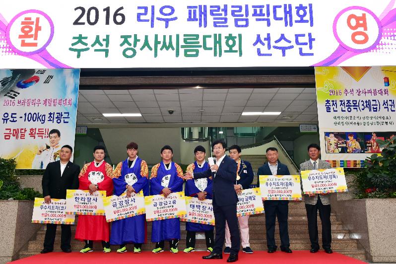 [미디어타임즈= 신정식 기자] 수원시는 26일 시청 본관 로비에서 2016 추석 장사씨름대회와 브라질 리우 패럴림픽대회에서 우수한 성적을 거둔 선수단에 대한 환영식을 가졌다.