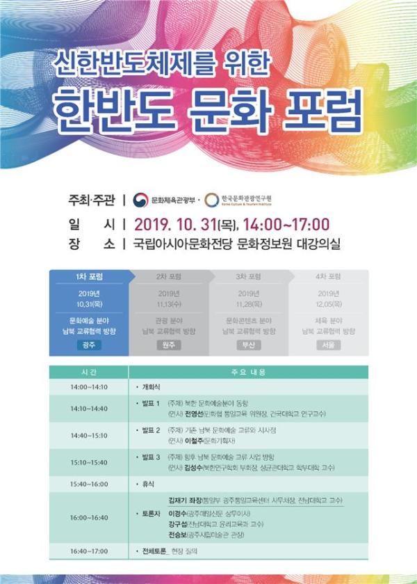 문화체육관광부는 한국문화관광연구원과 함께 오는 31일 오후 2시부터 5시까지 광주 국립아시아문화전당 문화정보원 대강의실에서 ‘제1차 한반도 문화 포럼’을 개최한다.