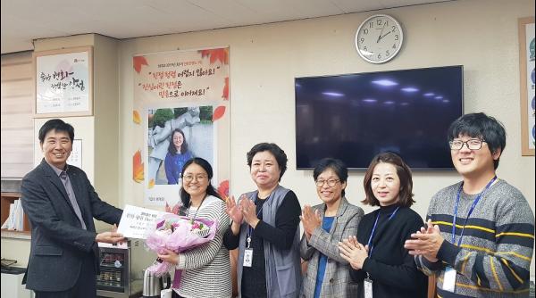이에 회계과는 전화친절도 개인별 공동1위로 선정된 재산관리팀 정현희 주무관을 이달의 베스트멤버로 선정하고 ‘친절·청렴 어렵지 않아요, 진심어린 친절은 믿음으로 이어져요’라는 표어와 베스트멤버의 모습이 담긴 현수막을 사무실 내에 게시했다.