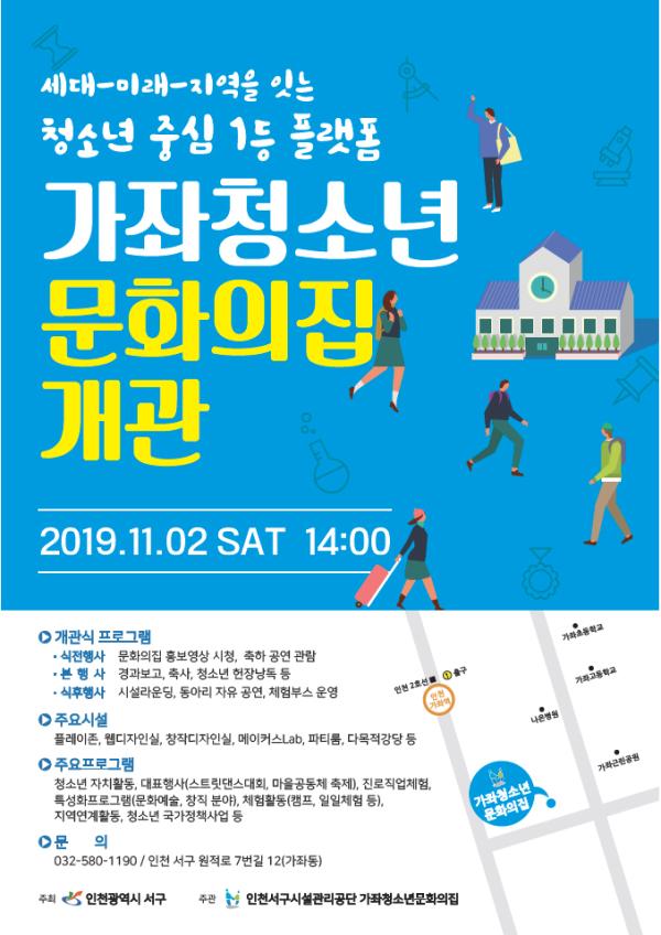 인천 서구는 가좌권역 청소년들의 전용공간으로 다양한 문화·예술·체험활동의 허브역할을 할 가좌청소년문화의집을 오는 2일 개관한다고 밝혔다.