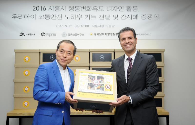 메르세데스-벤츠 사회공헌위원회는 스쿨존 주변의 불법 주정차 개선 및 어린이 안전한 길 건너기 유도 디자인 장치를 키트로 제작하여 시흥시에 전달하였고, 시흥시는 이와 관련하여 메르세데스-벤츠 사회공헌위원회와 관계 기관 및 연구소, NGO에 감사패를 증정하였다.