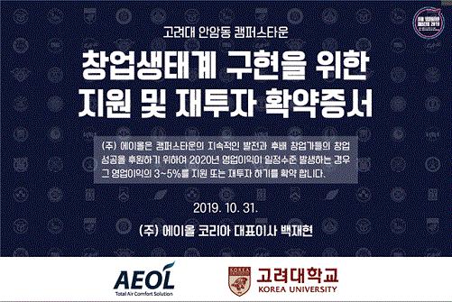 고려대학교 캠퍼스타운 성장 기업 ㈜에이올코리아의 백재현 대표가 후배 창업가 양성을 위해 올해부터 매출에 따라 영업이익의 3~5%를 캠퍼스타운 사업단에 기부하겠다고 발표한다. 창업초기의 캠퍼스타운 지원으로 기업이 성장한만큼 창업선배로서 자금지원, 멘토링, 컨설팅 등으로 후배 창업가를 돕겠다고 약속하는 것이다.