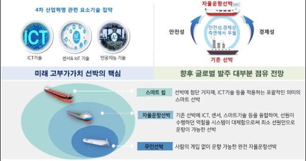 자율운항선박은 사물인터넷, 빅데이터, 인공지능 등 4차 산업혁명 관련 요소기술이 집약된 미래 고부가가치 선박이다.