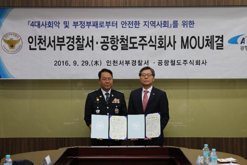 [미디어타임즈=문상수 기자]□ 인천서부경찰서(서장 반병욱)·공항철도주식회사(대표이사 이성희)는 지난 9월 29일 인천 서구 소재 공항철도 주식회사 2충 대회의실에서 4대 사회악 및 부정부패로부터 안전한 지역사회 조성을 위한 업무협약식을 개최하였다. 이는, 28일부터 부정청탁금지법이 시행되는 등 최근 청렴에 대한 국민적 관심이 고조되고 있는 상황에서, 청렴문화를 확산시키고 4대 사회악 등 범죄로부터 안전한 지역사회를 조성하기 위해 서로 실천의지를 공유하고 상승 효과를 가지고자 마련한 자리였다. 지하철 2호선이 개통된 후 兩 기관은, 공공장소인 지하철에서의 시민들의 안심도를 높이고 실질적인 범죄 예방을 도모하기 위해 실무자 회의를 계속 개최하는 등 머리를 맞대고 고민하였다. 뿐만 아니라, 인천서부경찰서 전 직원들을 대상으로 아이디어 공모전을 개최하는 등 좋은 아이디어를 얻기 위하여 노력하였다.그 결과, 兩 기관의 캐릭터 4종 (스피·나르·포돌이·포순이)을 활용하여, 시민들에게 친근하게 다가갈 수 있는 랩핑광고 포토존을 공항철도 검암역 환승통로에 설치하기에 이르렀다. 양 기관은 이번 업무협약식을 시작으로 ▵ 반부패․청렴문화 확산 및 4대 사회악 근절을 위한 홍보 ▵ 4대 사회악 등 범죄 예방을 위한 시설진단․환경개선 등 시민 안전 제고를 위해 상호 적극적으로 논의하고 다각적으로 공조할 예정이다. 이번 공모를 계획하고 진행해온 서부경찰서 여성청소년과 이새하 경장은 “아이디어를 생각하고 의견을 모으는 단계에서부터, 청렴문화 확산 및 4대 사회악으로부터 안전한 사회 환경 조성을 위한 兩 기관의 근절의지를 느낄 수 있었으며, 친근감 있는 캐릭터를 이용하여 만든 포토존을 통하여 시민들과 공감대를 형성할 수 있는 좋은 계기가 되었으면 좋겠다”고 전했다.인천서부경찰서장(반병욱)은 “금일의 업무협약을 시작으로 兩 기관간 청렴·안전 등 제고, 범죄근절을 위한 예방활동 등 공조 범위를 다각화하여 시민들이 안전하고 행복한 도시를 만들어 나가는 한편, 시민들이 범죄나 위험에 노출되지 않도록 치안에 최선을 다하겠다.” 고 전했다.