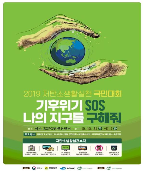 환경부는 전라남도, 여수시, 한국기후·환경네트워크와 공동으로 ‘2019 저탄소생활 실천 국민대회’를 오는 31일부터 11월 1일까지 전라남도 여수시 엑스포컨벤션센터에서 개최한다.