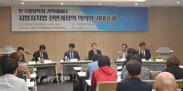 이원희 수원시 자치분권협의회 의장이 좌장을 맡은 지정토론에는 노민호 수원시 자치분권협의회 위원, 문병기 차기 한국지방자치학회장, 전광섭 한국거버넌스학회장, 김재훈 한국지방재정학회장 등이 참여했다.