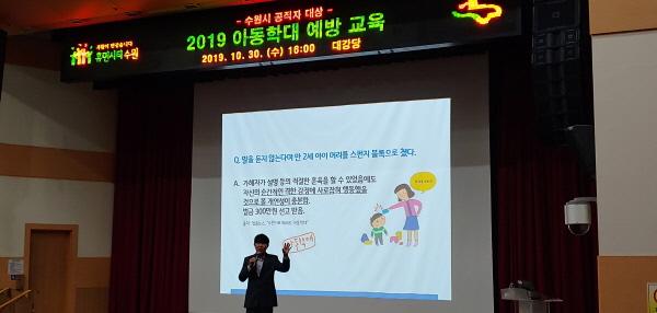 수원시가 지난 30일 시청 대강당에서 연 ‘2019 공직자 아동학대 예방 교육’에서 강의한 정욱재 수원아동보호전문기관 아동학대 사례관리팀장은 아동학대를 발견했을 때 대처 방법을 자세하게 설명했다.