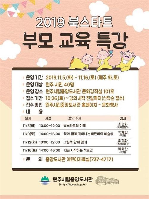 원주시립중앙도서관이 북스타트 프로그램의 일환으로 오는 11월 5일부터 16일까지 ‘2019 북스타트 부모교육 특강’을 운영한다.