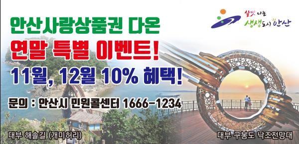 안산시는 소상공인 보호와 골목경제 활성화를 위해 오는 11월부터 12월까지 두 달 동안 지역화폐 다온의 연말 10% 특별할인을 실시한다고 31일 밝혔다.