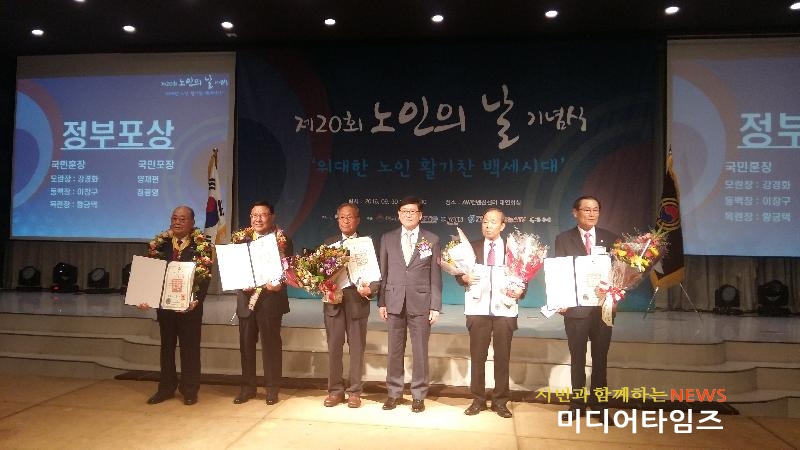 [미디어타임즈=문상수 기자]양재편 대한노인회 인천서구지회장은 지난 30일 서울 종로구 AW컨벤션센터에서 열린 제20회 노인의 날 기념식에서 노인복지에 기여한 공을 인정받아 국민포장을 수상했다. 보건복지부에서 주최하고 (사)대한노인회에서 주관한 이번 기념식은 ‘위대한 노인, 활기찬 백세시대’를 주제로 10월 경로의 달을 맞아 나라발전과 사회의 중추적 역할을 다해 오신 어르신들의 노고에 감사드리는 사회적 분위기 조성을 위해 마련되었으며, 노인복지 유공자 등 훈․포장 수상자와 대한노인회 관계자 등 500여명이 참석한 가운데 성황리에 진행됐다. 양재편 지회장은 2011년 서구 검단노인분회장을 거쳐 2014년 4월 1일 제9대 인천서구노인지회장으로 취임하여 현재까지 인천 서구를 대표하는 어르신으로서 그간 노인복지 증진을 위해 헌신의 노력을 기울여 왔다.광의 국민 포장을 수상한 양재편 지회장은앞으로도 노인복지 증진을 위해 최선을 다하겠으며, 고령화 시대에 걸맞는 노인상을 정립하고 활기찬 백세시대를 열기 위해 더욱 노력하겠다.며 수상소감을 밝혔다.