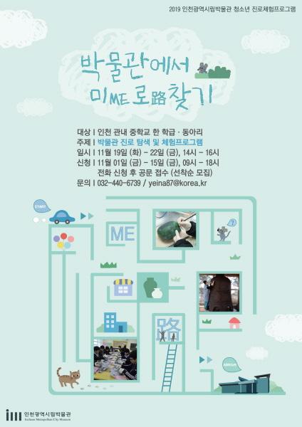 인천광역시 시립박물관에서는 오는 11월 1일부터 15일까지 청소년 진로체험교육 ‘박물관에서 미로찾기’에 참가할 중학교 단체를 선착순 모집한다고 밝혔다.