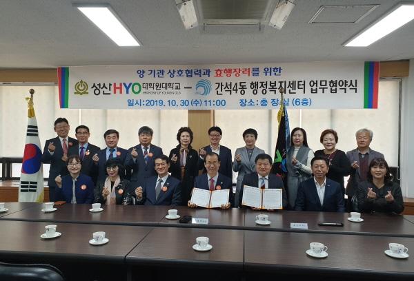 이날 간석4동장 및 자생단체장, 성산효대학원대학교 총장 및 교수진 등 20여명이 참석한 가운데 협약식이 체결됐다.