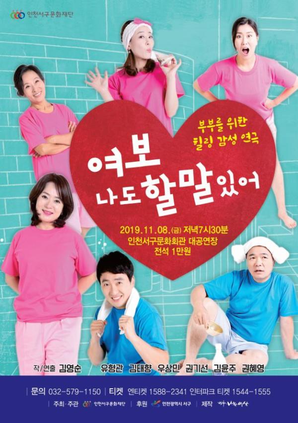 인천서구문화재단이 마련한 온가족을 위한 힐링 연극 2 ‘여보, 나도 할 말 있어’는 오는 8일 금요일 오후 7시에 30분에 인천서구문화회관 대공연장에서 관람할 수 있으며 전석 1만원에 예매할 수 있다. 문의는 인천서구문화재단 공연전시팀으로 하면 된다.