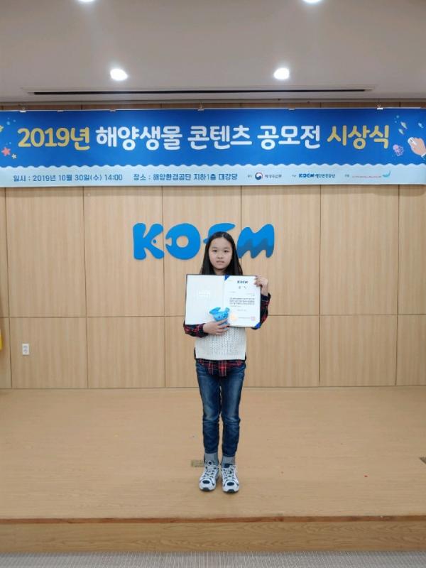 연수구 송도국제어린이도서관 웹툰 프로그램 ‘나도 이제 글로벌 웹툰 작가’에 참여한 이지현 학생의 작품이 지난 30일 해양환경공단에서 열린 ‘2019년 제6회 해양생물 콘텐츠 공모전’ 에서 ‘바다사랑상’을 수상했다.