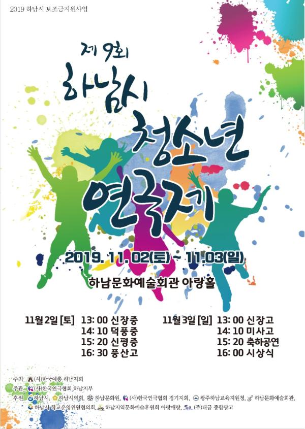 한국연극협회 하남지부는 오는 11월 2일부터 3일까지 2일간‘제9회 하남시 청소년 연극제’를 하남문화예술회관 아랑홀에서 개최한다.