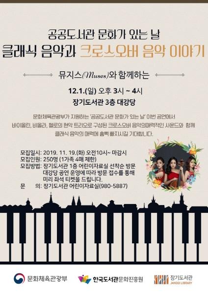 뮤지스의 공연은 오는 12월 2일 오후 3시부터 4시까지 장기도서관 3층 대강당에서 진행되며 11월 19일 오전 10시부터 장기도서관 1층 어린이자료실에서 방문 접수로 진행된다.