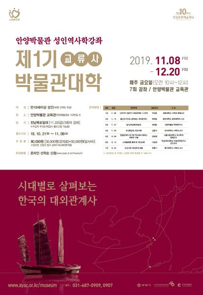 ‘제1기 박물관대학’은 고고학, 역사학, 미술사학, 민속학 등 다양한 분야의 최고의 전문가들을 초빙한 이론 강좌와 안양박물관 학예연구사와 함께하는 생생한 현장 답사 프로그램 구성으로 이루어진다. 이번 교육은 ‘시대별로 살펴보는 한국의 대외관계사’라는 주제로 고대 동아시아 문화교류를 시대별로 살펴보고 이를 통해 한반도를 둘러싼 국제 관계의 흐름과 우리 역사의 정체성을 탐구하는 내용으로 총 7주 동안 펼쳐진다. 특히 11월 22일에는 이론 강좌와 더불어 전남 목포 일대의 현장 답사도 함께 마련되어 있어 생각해 볼 수 있는 기회가 될 것이다.