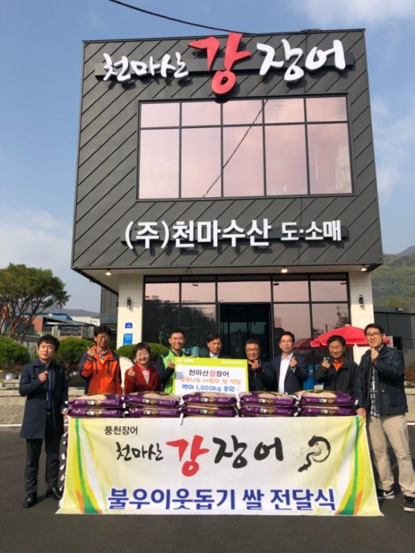 천마산강장어는 수익금의 일부를 지역에 환원해 지역사회의 어려운 이웃에 작은 보탬이 되고자 양곡 20Kg 50포를 기부하게 됐다.