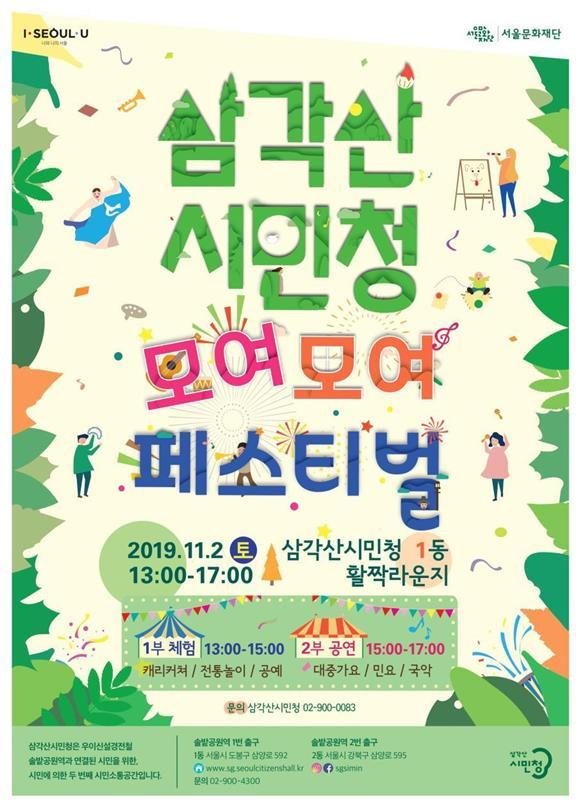 4060세대 시민기획에 의한 삼각산시민청 모여모여 페스티벌은 11월 2일 토요일 오후 1시부터 5시까지 삼각산시민청에서 진행되며 다채로운 공연과 체험·전시 프로그램을 선보인다.