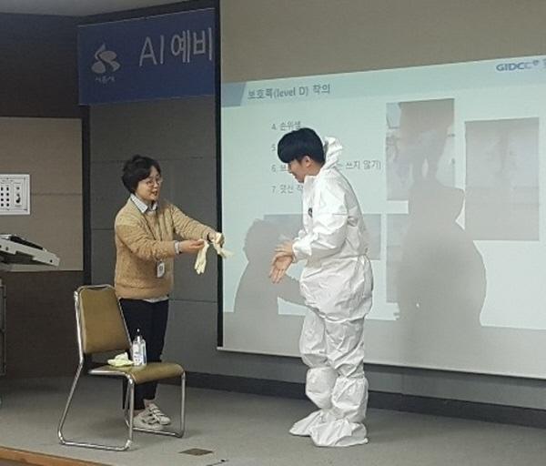 이번 교육은 조류인플루엔자 발생 시 AI대응요원의 안전을 위한 개인 보호구 착·탈의 실습 등이 진행됐다.