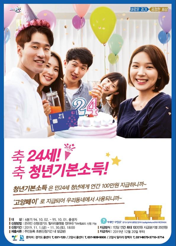 신청대상은 1994년 10월 2일부터 1995년 10월 1일에 출생한 만24세 청년으로 재산, 소득, 취업여부에 관계없이 신청일 현재 고양시에 3년 연속 거주 또는 경기도 내 합산 10년이상 주민등록자이면 누구나 신청할 수 있으며 분기별로 1인당 25만원씩 최대 연100만원을 지역화폐로 지급 받는다.