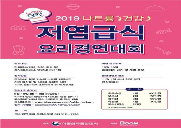 식품의약품안전처는 덜달고 덜짠 음식의 대중화를 위해 1일 한식문화관에서 ‘2019년 저염급식·건강한 빵 요리경연대회‘를 개최한다.