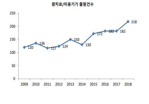 특허청에 따르면, 광학 치료·미용기기의 특허출원은 2014년 이전 5년간 연평균 출원 건은 약 130건 내외로 큰 변화가 없었으나, 2014년 이후에는 연평균 14% 증가하고 있는 것으로 나타났다.