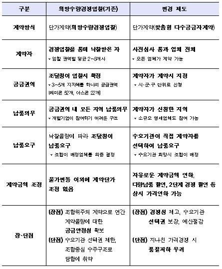 수요기관이 업체를 직접 선택할 수 있도록 하되, 선택에 어려움을 겪는 기관을 위해 수요기관이 희망할 경우는 기존처럼 조합이 물량을 배정할 수 있도록 했다. 다량수요 물량은 가격경쟁을 통해 다수의 업체에게 공급물량을 차등 배분할 수 있도록 했다.