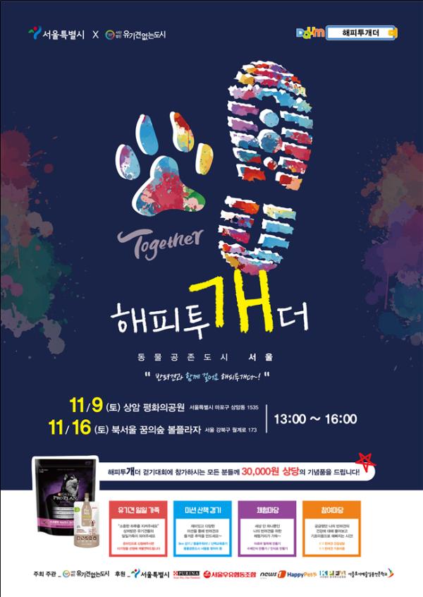 해피투개더 행사는 걷기대회와 유기견 일일 가족 프로그램, 펫티켓미션 산책 경기가 진행되며 다양한 체험·참여마당을 마련해 시민들을 맞이한다.