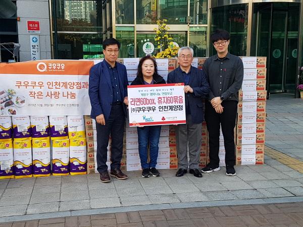 ㈜쿠우쿠우 인천계양점에서는 지난달 28일 라면 60박스와 화장지 60묶음을 계양구청에 기탁했다.