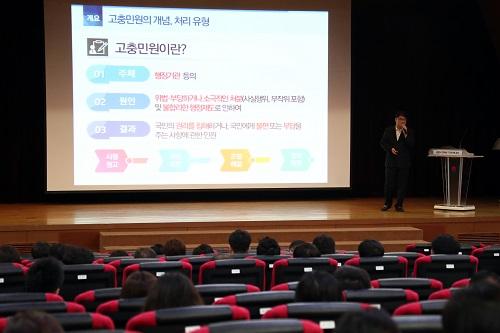 이날 국민권익위원회 고충처리국 김영표 조사관이 강사로 나서 낙도 도선운항 길 마련, 가정폭력 피해자 보호를 위한 거주불명 등록 제외 개선, 군 복무 중 발생한 정신질환의 보훈대상 인정 등 적극행정으로 국민의 삶의 질을 크게 향상시킨 대표적인 적극행정 실천 사례를 중심으로 소극행정으로 인한 고충민원 발생 사례도 함께 교육을 실시했다.