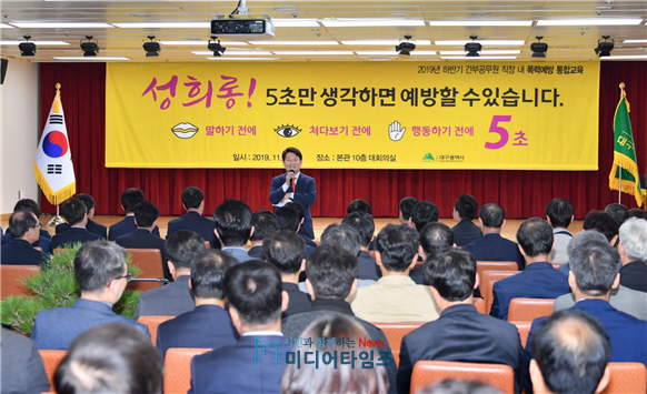 대구시는 1일 시청 본관 10층 대회의실에서 간부 공무원 400여명이 참석한 가운데 법무법인 온세상의 김재련 변호사를 초빙해 하반기 직장 내 폭력예방 통합교육을 실시했다.
