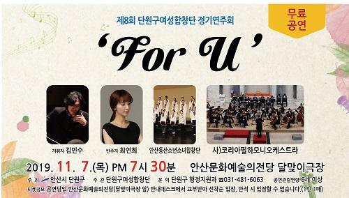 무료공연인 이번 연주회는 독일유학파 김민수 단원구여성합창단 지휘자를 중심으로 시민을 위한 음악회로 진행되며 ‘For U’를 주제로 ‘다함께 즐겨보는 시간을 갖자’는 의미로 기획됐다.