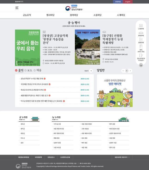 새로 구축된 궁능유적본부 누리집에서는 총 5개 주제별로 궁·능에 대한 기본 정보와 관람, 행사, 각종 소식, 조직소개 등 종합적인 정보를 볼 수 있다. 누리집 주소는 궁과 능의 영문에 공통으로 들어간 ’royal’로 정해 기억하기 쉽도록 했다.
