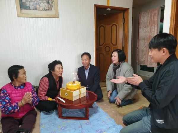 생신날에는 결연자 외에도 주민자치위원들이 자리를 함께하며 정성스럽게 준비한 쌀 케이크와 선물을 전달하며 생신을 축하드린다.