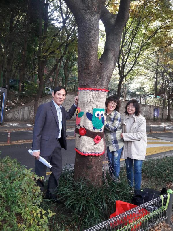 이에 따라 수리동은 2월에 뜨개질 재능기부자 모집, 3~4월 재능기부자 대상 뜨개질 교육, 5~10월 뜨개옷 제작하기를 거쳐 이달 첫날 마을 주민들이 자주 이용하는 산책로의 가로수 100그루에 제작자들의 개성이 반영된 뜨개옷 입히기를 시행했다.
