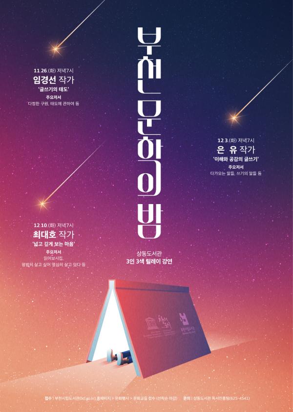 부천시 상동도서관에서는 오는 26일부터 12월 10일까지 매주 화요일 7시 3회에 걸쳐 인기 작가와 함께하는 ‘부천 문학의 밤’ 릴레이 강연회를 개최한다.