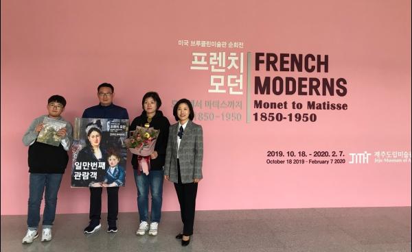 1만 번째 주인공은 부산 해운대에서 가족여행을 온 문치운 님 가족으로 초등학생 자녀와 함께 제주를 찾았다. 문씨는 “제주에서 귀한 전시를 관람할 수 있게 되어 더욱 뜻깊은 가족여행이 될 것 같다”고 말했다. 문준경 학생은 “클로드 모네의 작품에서 따뜻한 분위기를 느낄 수 있어 좋았다”며 “내년에 기회가 되면 다시 관람하고 싶다”고 밝혔다.