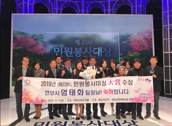 안양시는 지난 1일 SBS 상암동 공개홀에서 열린 행정안전부·SBS 공동주관, 제23회 민원봉사대상 시상식에서 엄태화 여권팀장이 전국에선 유일한 대상 영예를 안으며 본인과 안양시의 명예를 빛냈다고 4일 밝혔다. 이날 시상식은 11월 5일 오후 4시 SBS-TV를 통해 전국에 녹화방영될 예정이다.